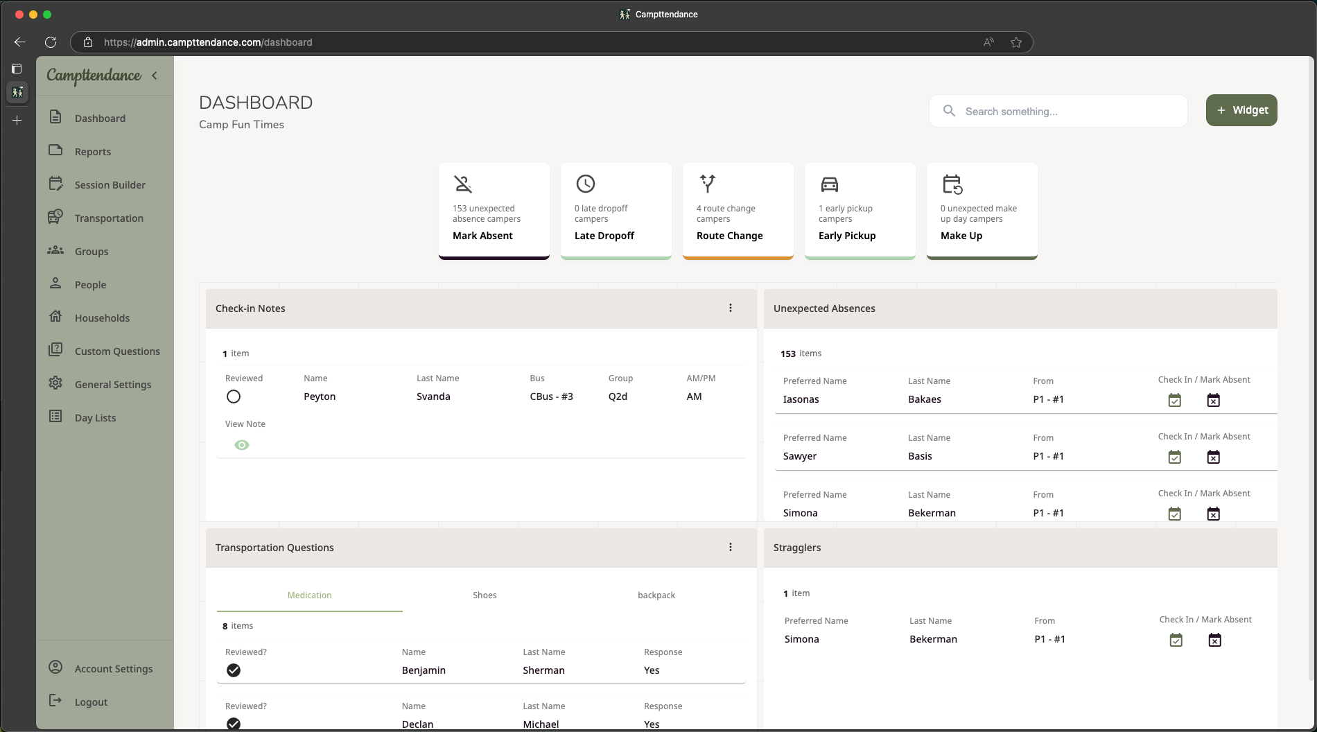 Best of all? Your team can save hours every day by letting the system compare attendance lists so you don’t have to! No more running and comparing reports to make sure campers got to the right place. The admin dashboard has a widget to show you those details in real time, as it’s happening.